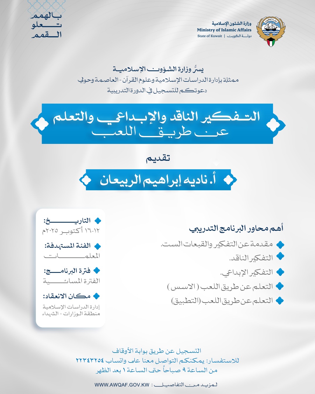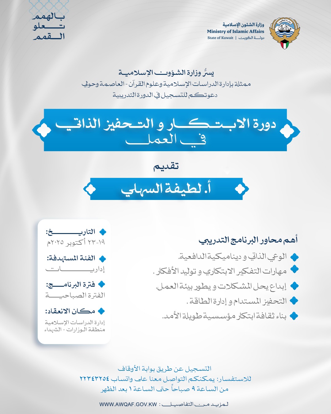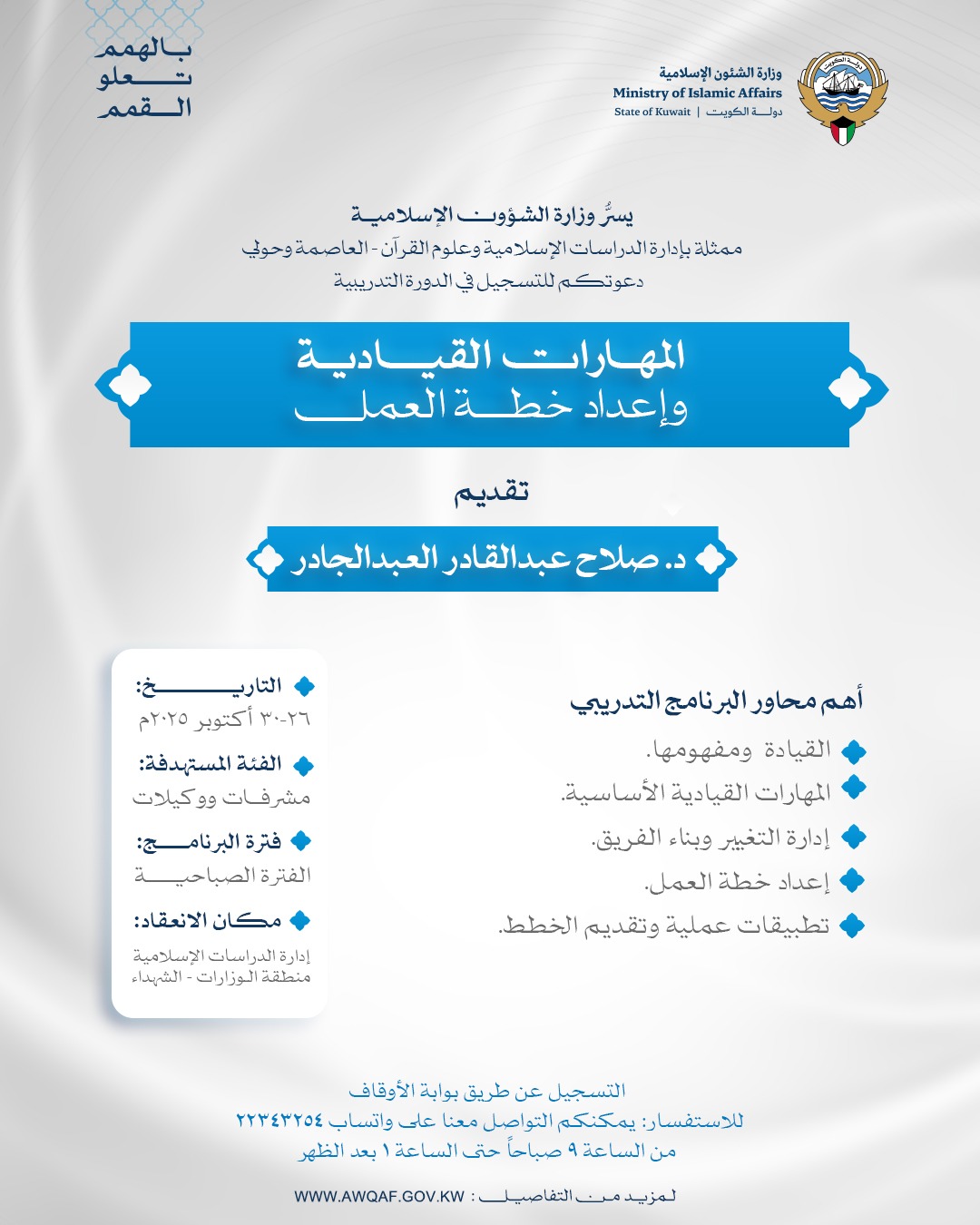 أعلنت إدارة الدراسات الإسلامية وعلوم القرآن الكريم بمحافظتي العاصمة وحولي بوزارة الشؤون الإسلامية عن إطلاق مجموعة من البرامج التدريبية المتنوعة، التي تأتي تحت شعار: (بالهمم تعلو القمم)، وذلك في إطار جهود الوزارة الرامية إلى الارتقاء بالمستوى العلمي والمهني للعاملين في الحقل الدعوي والتعليمي والإداري.