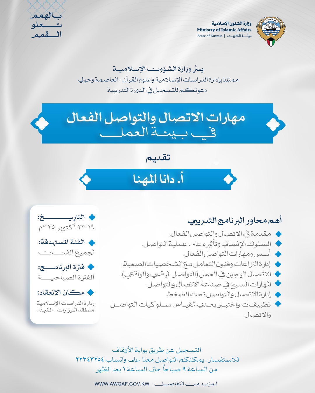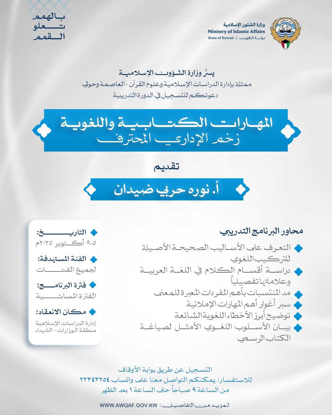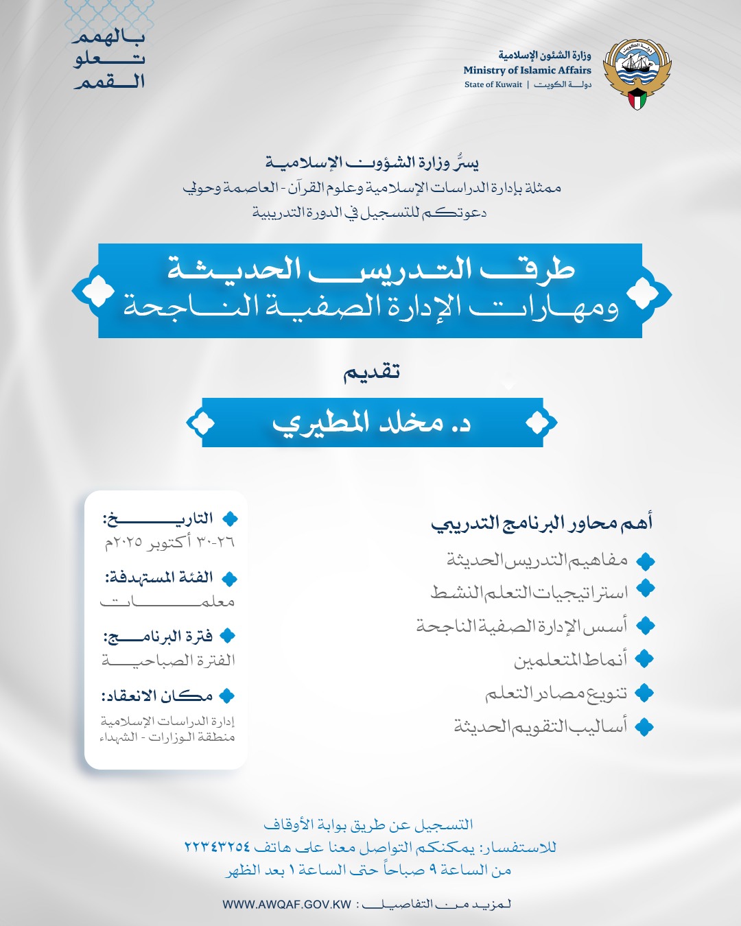 وتقام الدورات خلال شهر أكتوبر 2025، بفترات صباحية ومسائية، وذلك في مقر إدارة الدراسات الإسلامية وعلوم القرآن الكريم بمنطقة الوزارات – الشويخ.