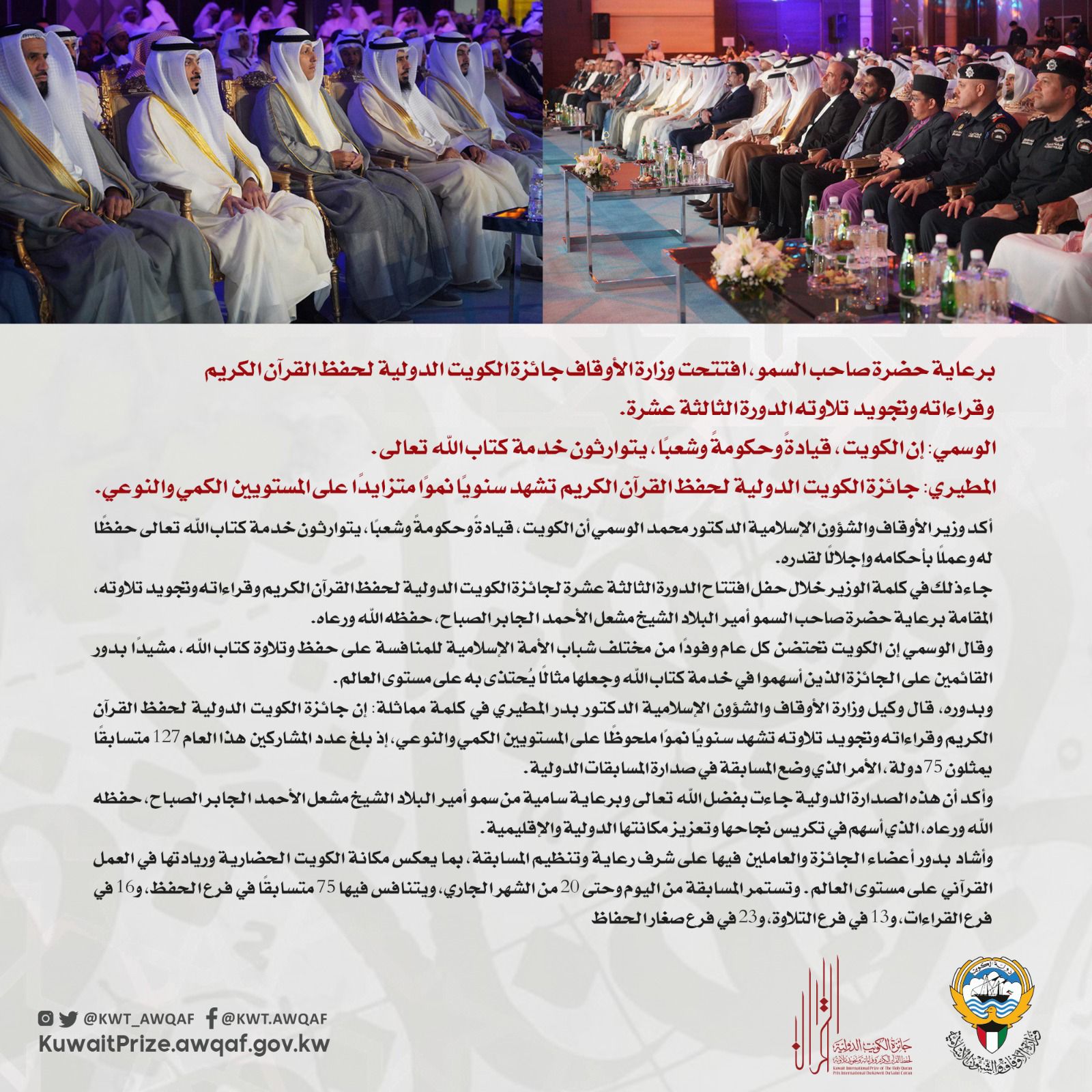 افتتاح الدورة الثالثة عشرة لجائزة الكويت الدولية لحفظ القرآن الكريم وقراءاته وتجويد تلاوته