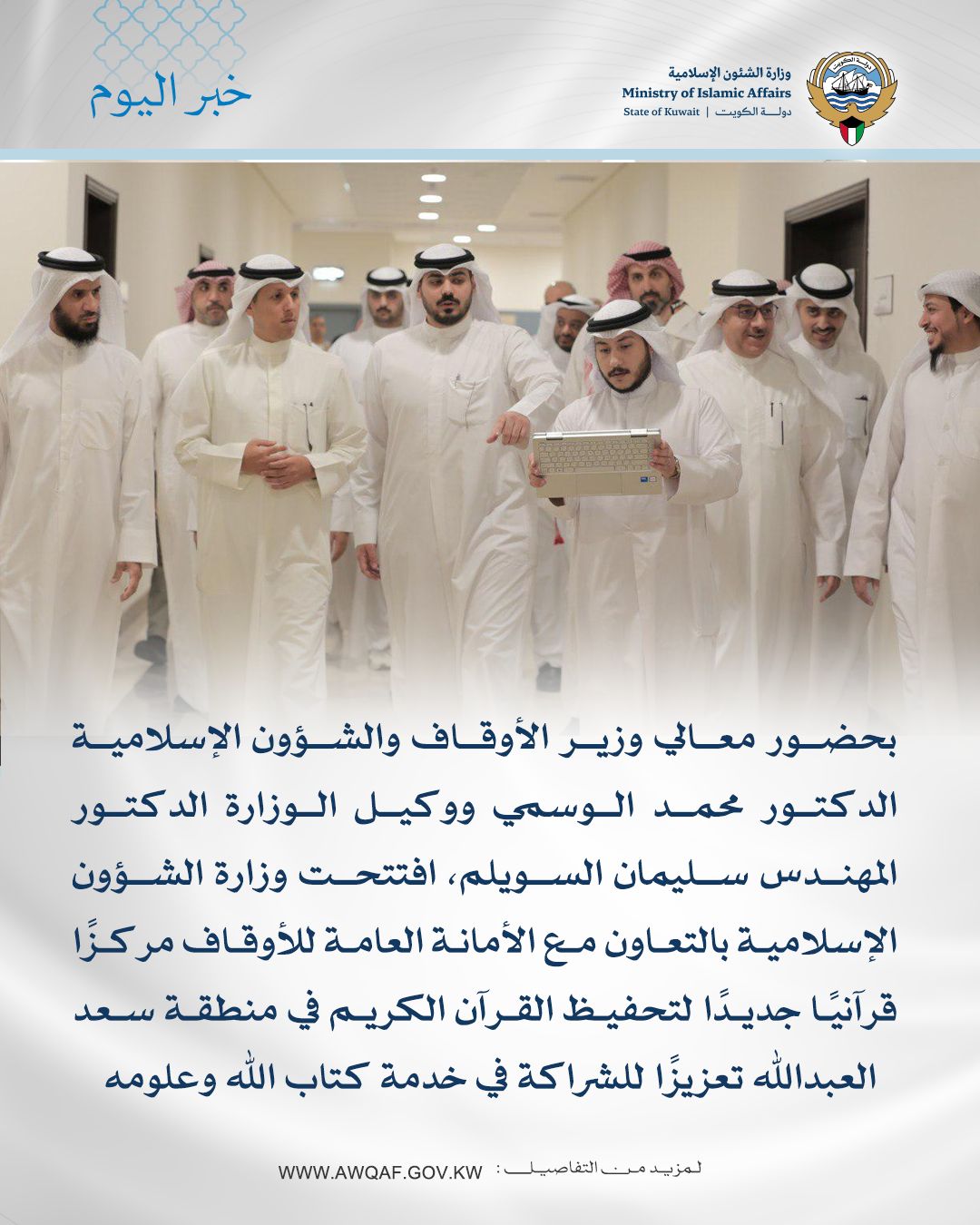 افتتح وزير الأوقاف والشؤون الإسلامية الدكتور محمد الوسمي يوم الأربعاء مركز الأمانة العامة للأوقاف لتحفيظ القرآن الكريم في منطقة سعد العبدالله الذي يعد صرحا قرآنيا متميزا وثمرة للتعاون بين الوزارة والأمانة العامة للأوقاف لخدمة كتاب الله وعلومه.