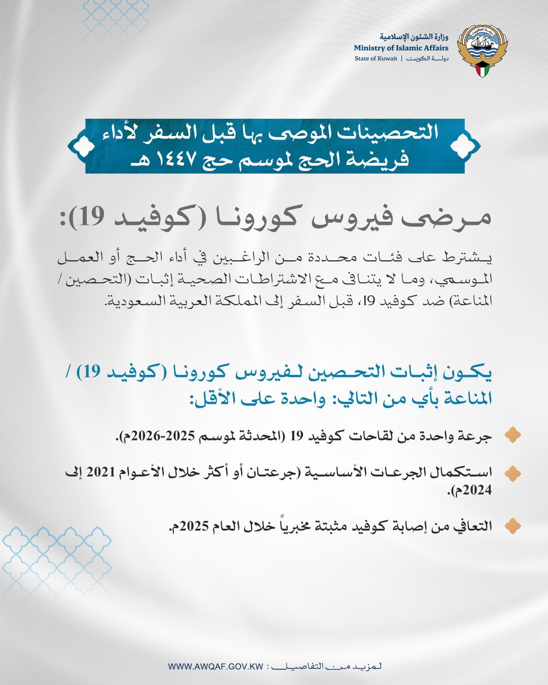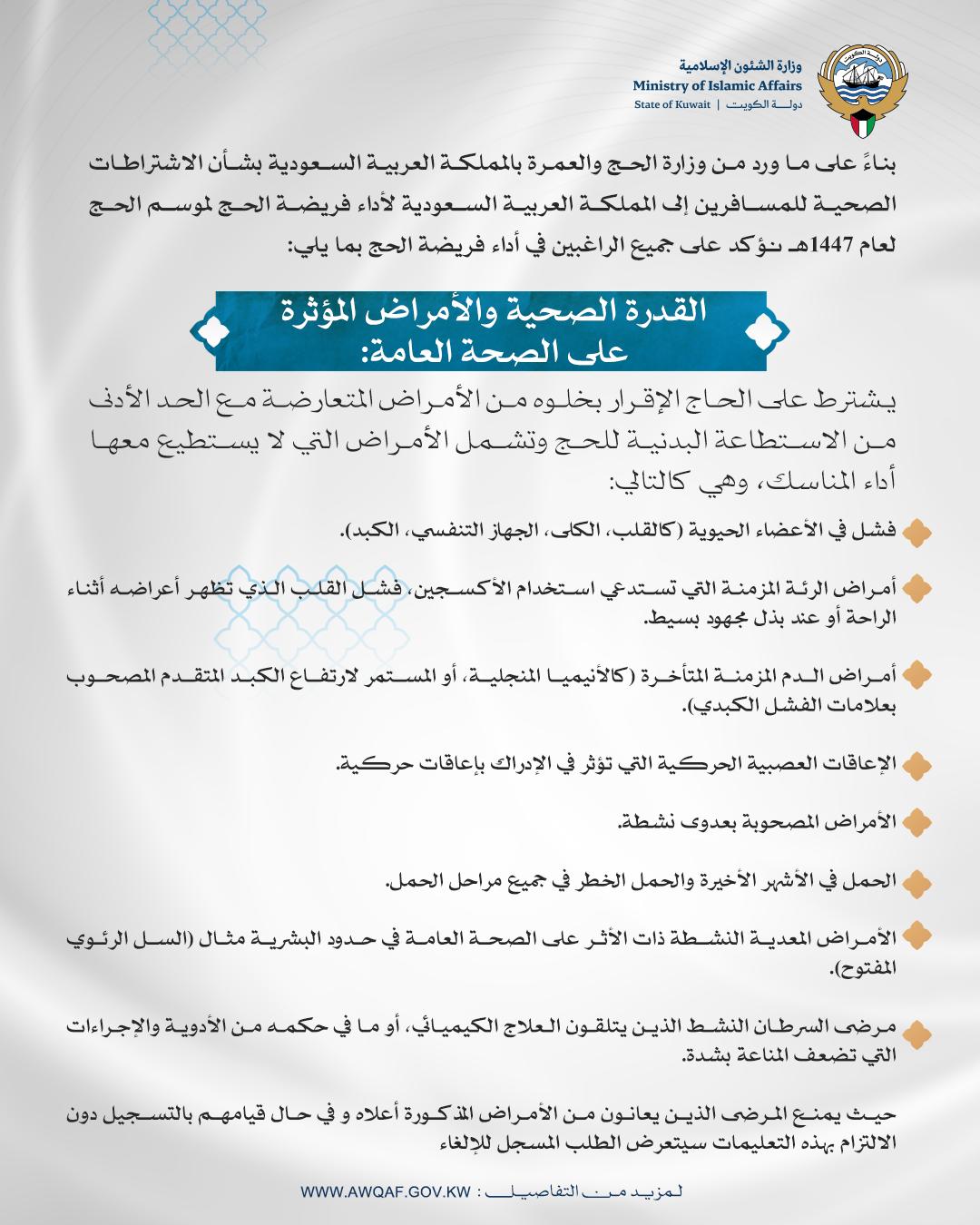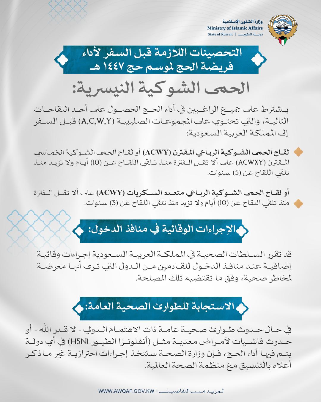 بناءً على ما ورد من وزارة الحج والعمرة بالمملكة العربية السعودية بشأن الاشتراطات الصحية للمسافرين إلى المملكة العربية السعودية لأداء فريضة الحج الموسم الحج لعام 1447هـ نؤكد على جميع الراغبين في أداء فريضة الحج بما يلي: