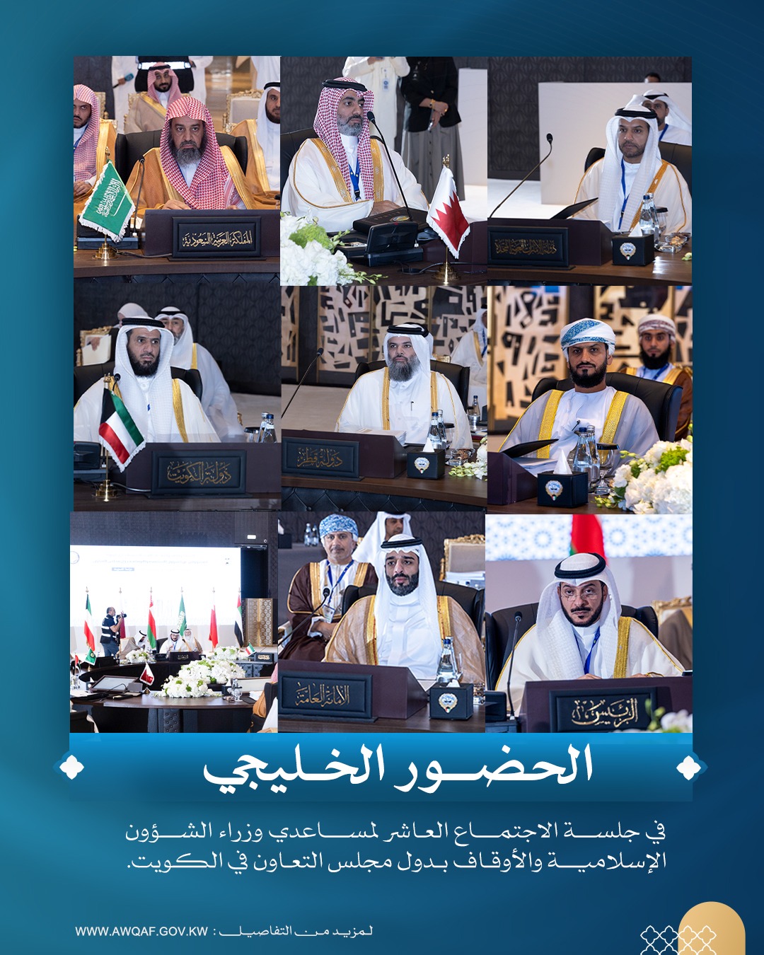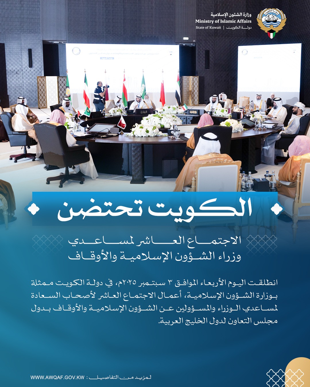 انطلقت يوم الأربعاء الموافق 3 سبتمبر 2025م، في دولة الكويت ممثلة بوزارة الشؤون الإسلامية، أعمال الاجتماع العاشر لأصحاب السعادة مساعدي مسؤولي وزارات الشؤون الإسلامية والأوقاف بدول مجلس التعاون لدول الخليج العربية، بمشاركة وفود خليجية.