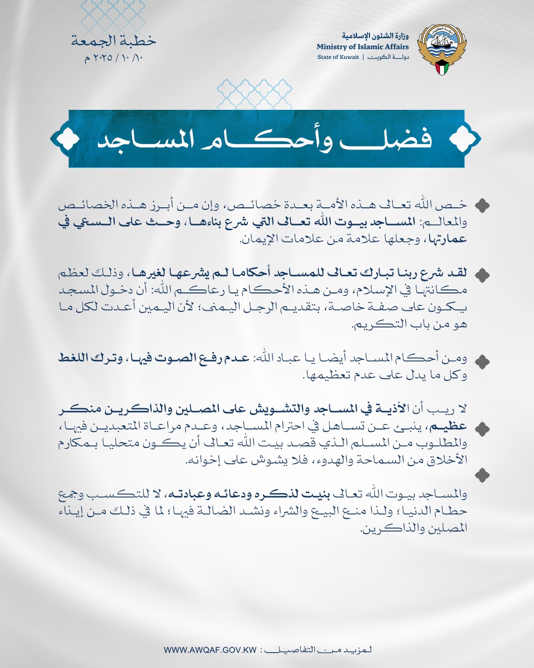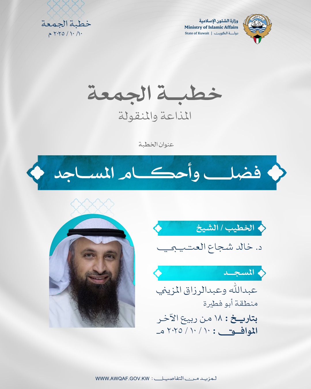 خطبة الجمعة المذاعة والموزعة بتاريخ 18 من ربيع الآخر 1447 هـ - الموافق 10 / 10 / 2025م