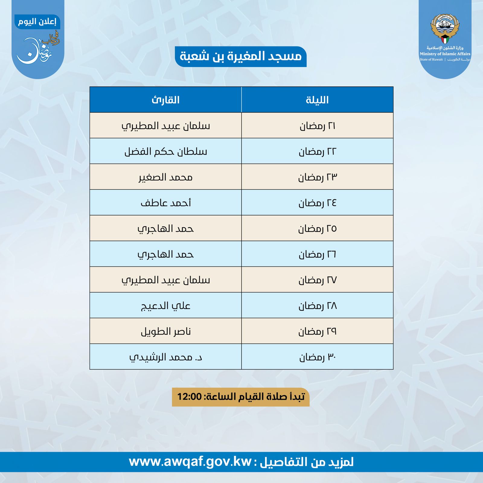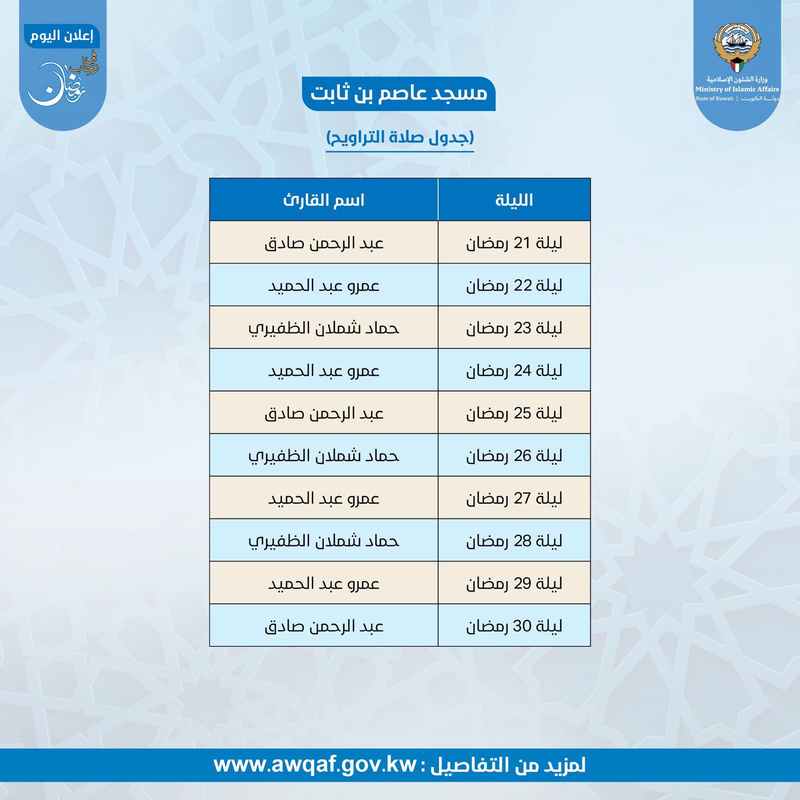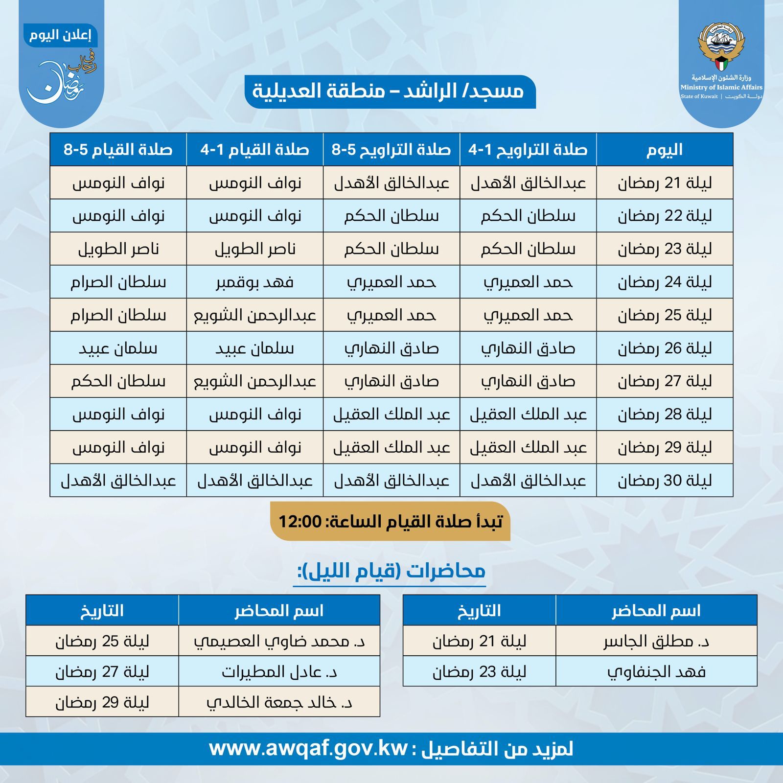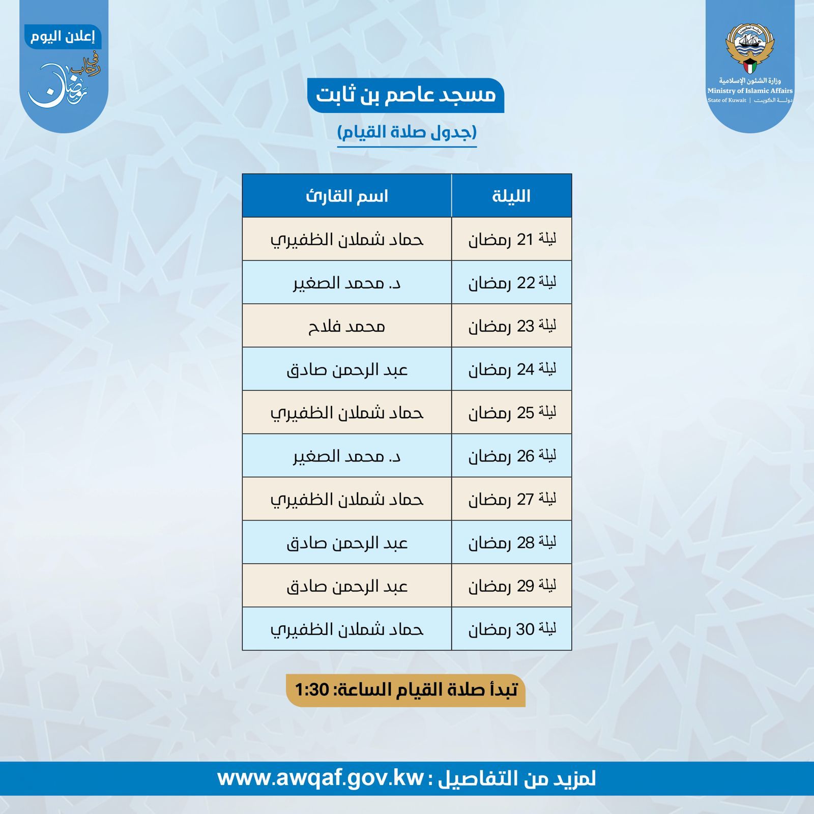 قراء صلاة التراويح والقيام في مساجد محافظة العاصمة خلال العشر الأواخر من شهر رمضان المبارك ١٤٤٦ هـ - ٢٠٢٥م